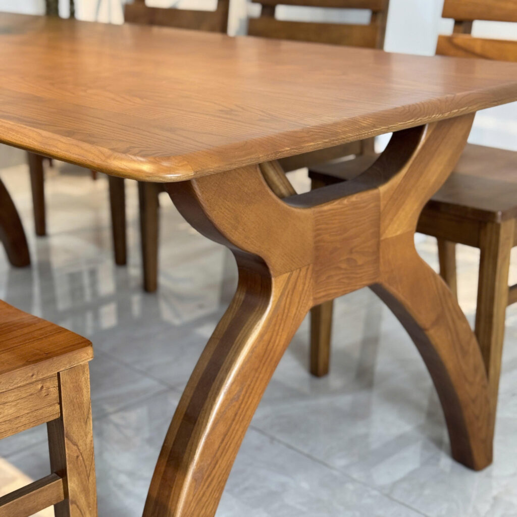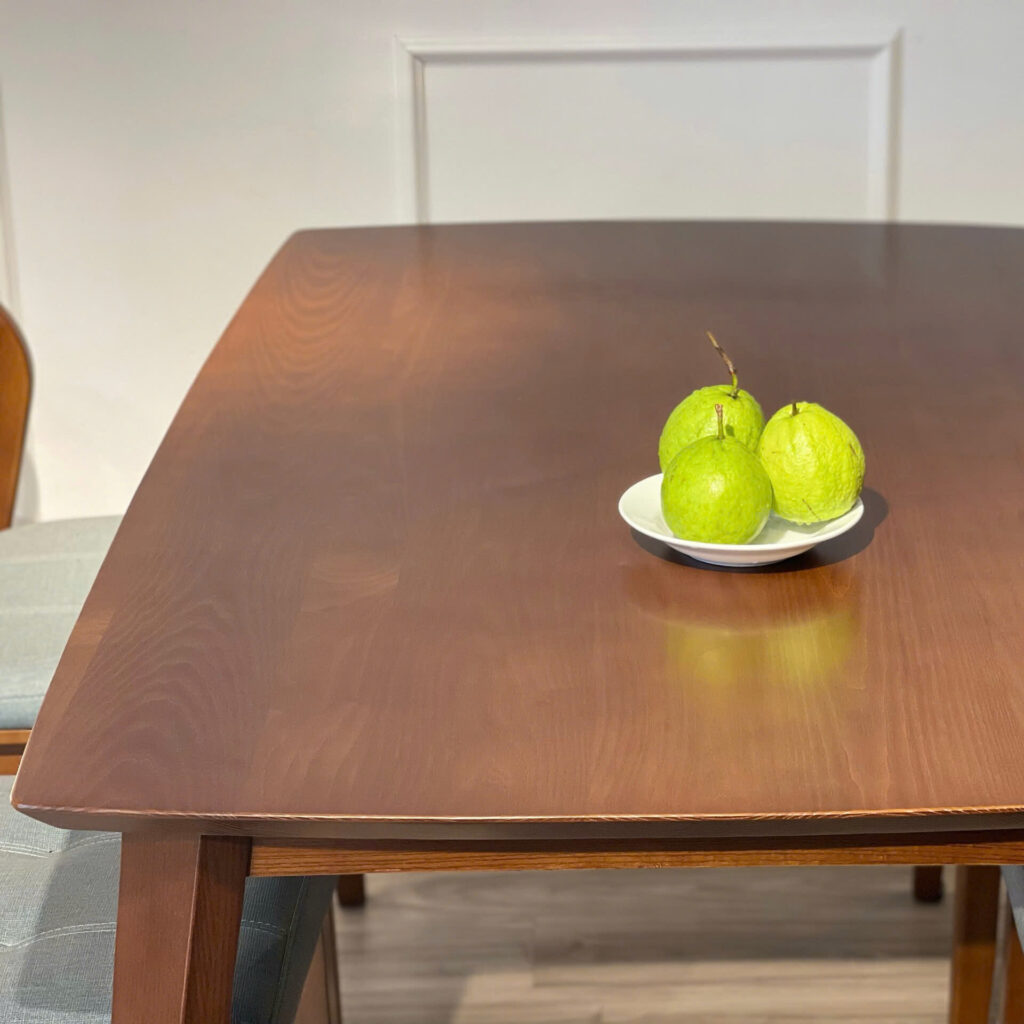 Mặt bàn gỗ hoàn thiện sơn NC, giữ trọn vân gỗ tự nhiên, bề mặt mịn và sắc nét ở từng chi tiết bo cạnh.