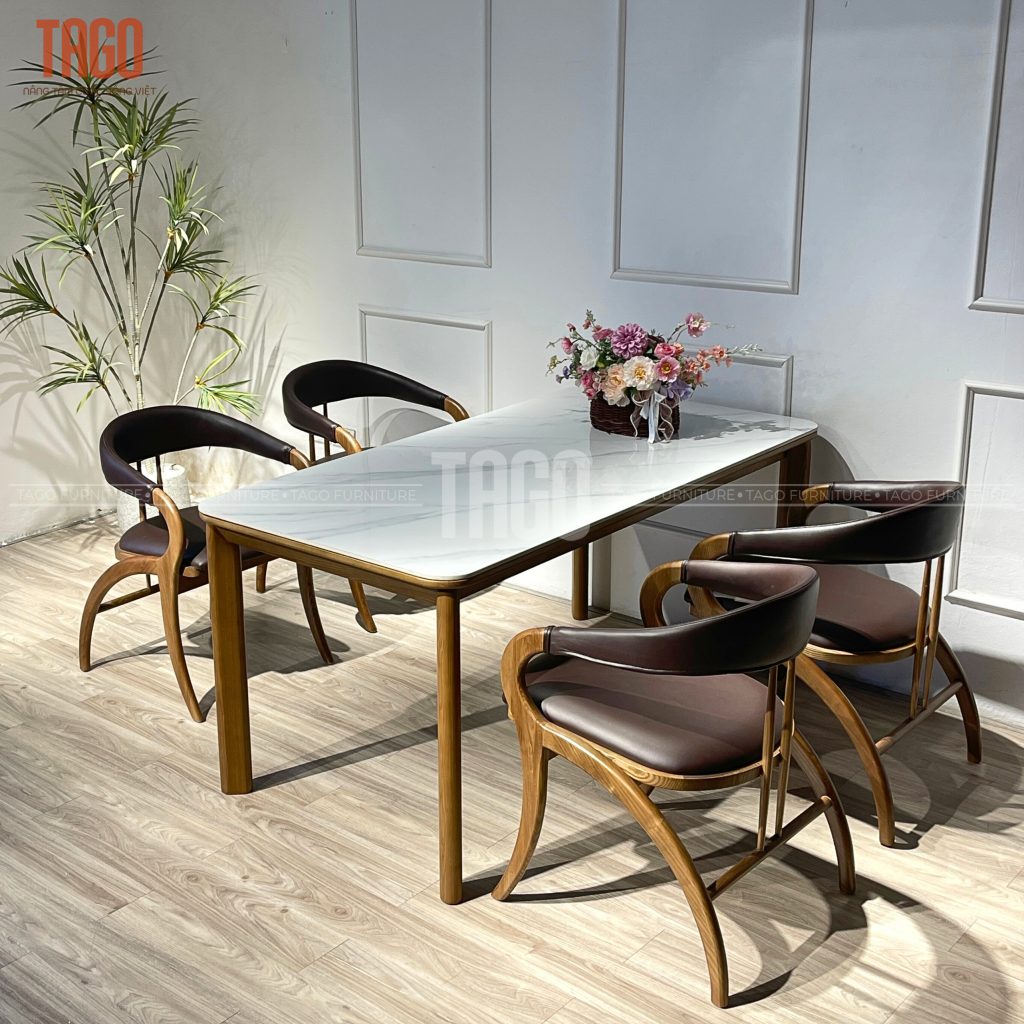 Ghế được làm từ gỗ sồi tự nhiên, nổi bật với dáng lưng uốn cong ôm trọn cơ thể, tạo cảm giác thoải mái khi ngồi lâu. Mặt ghế bọc nệm da cao cấp, dễ vệ sinh và bền màu theo thời gian, mang lại vẻ đẹp hiện đại và sang trọng cho bộ bàn ăn.