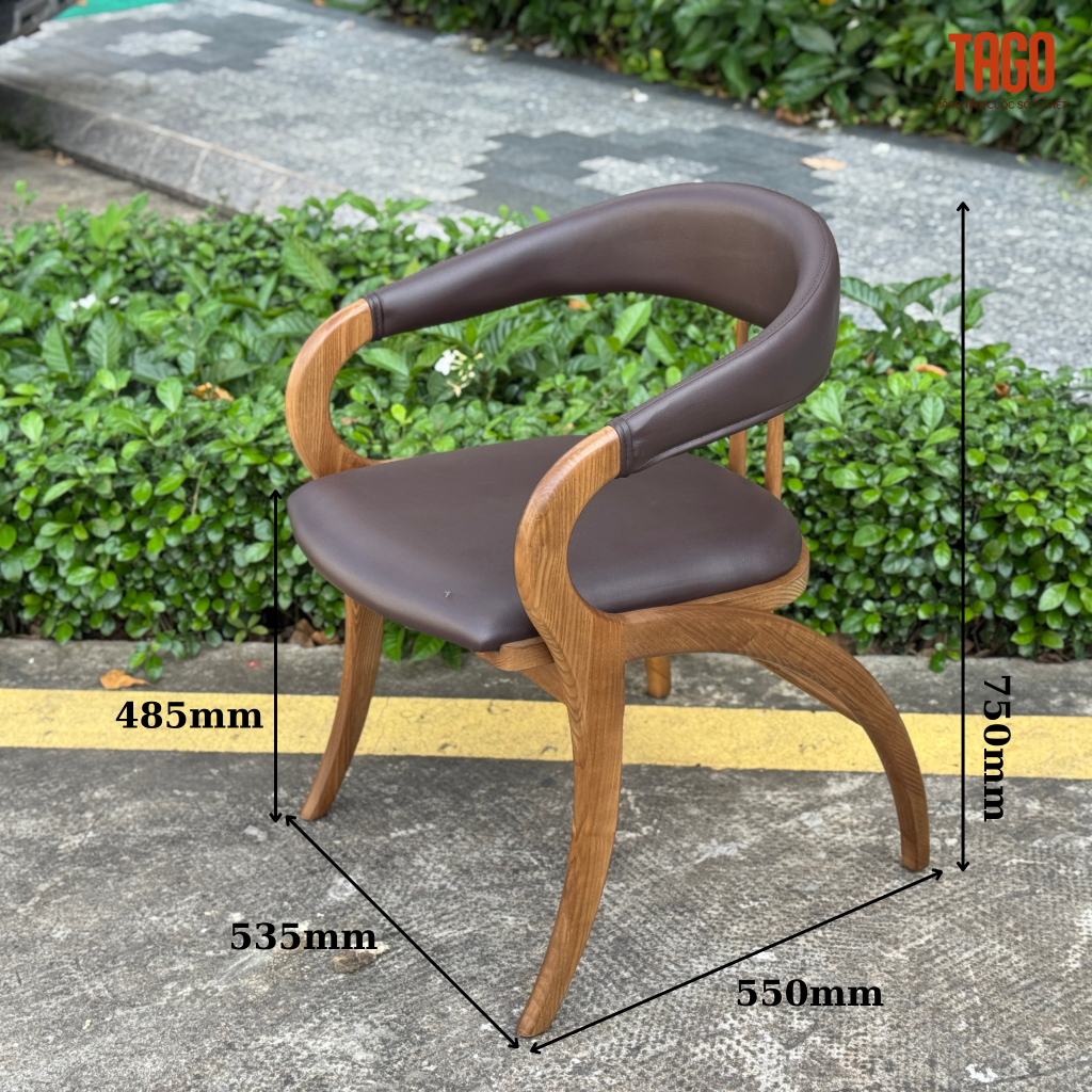 Ghế được làm từ gỗ sồi tự nhiên, nổi bật với dáng lưng uốn cong ôm trọn cơ thể, tạo cảm giác thoải mái khi ngồi lâu. Mặt ghế bọc nệm da cao cấp, dễ vệ sinh và bền màu theo thời gian, mang lại vẻ đẹp hiện đại và sang trọng cho bộ bàn ăn.