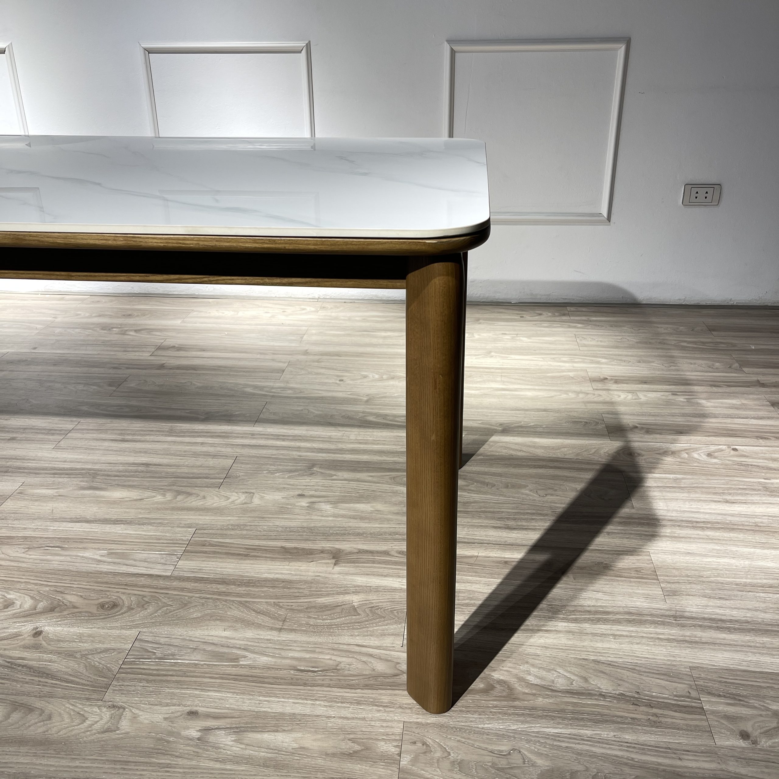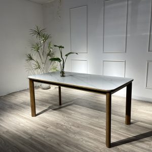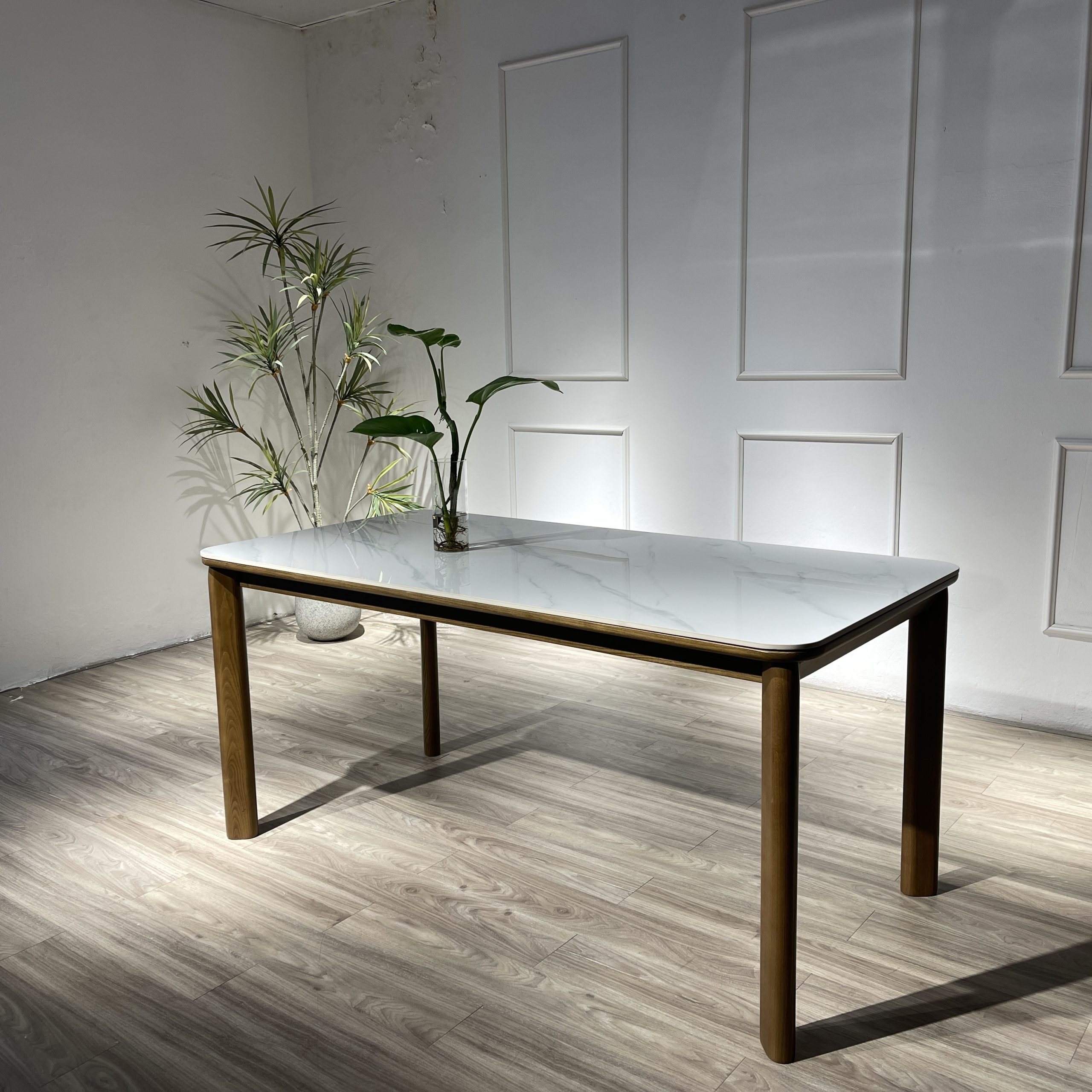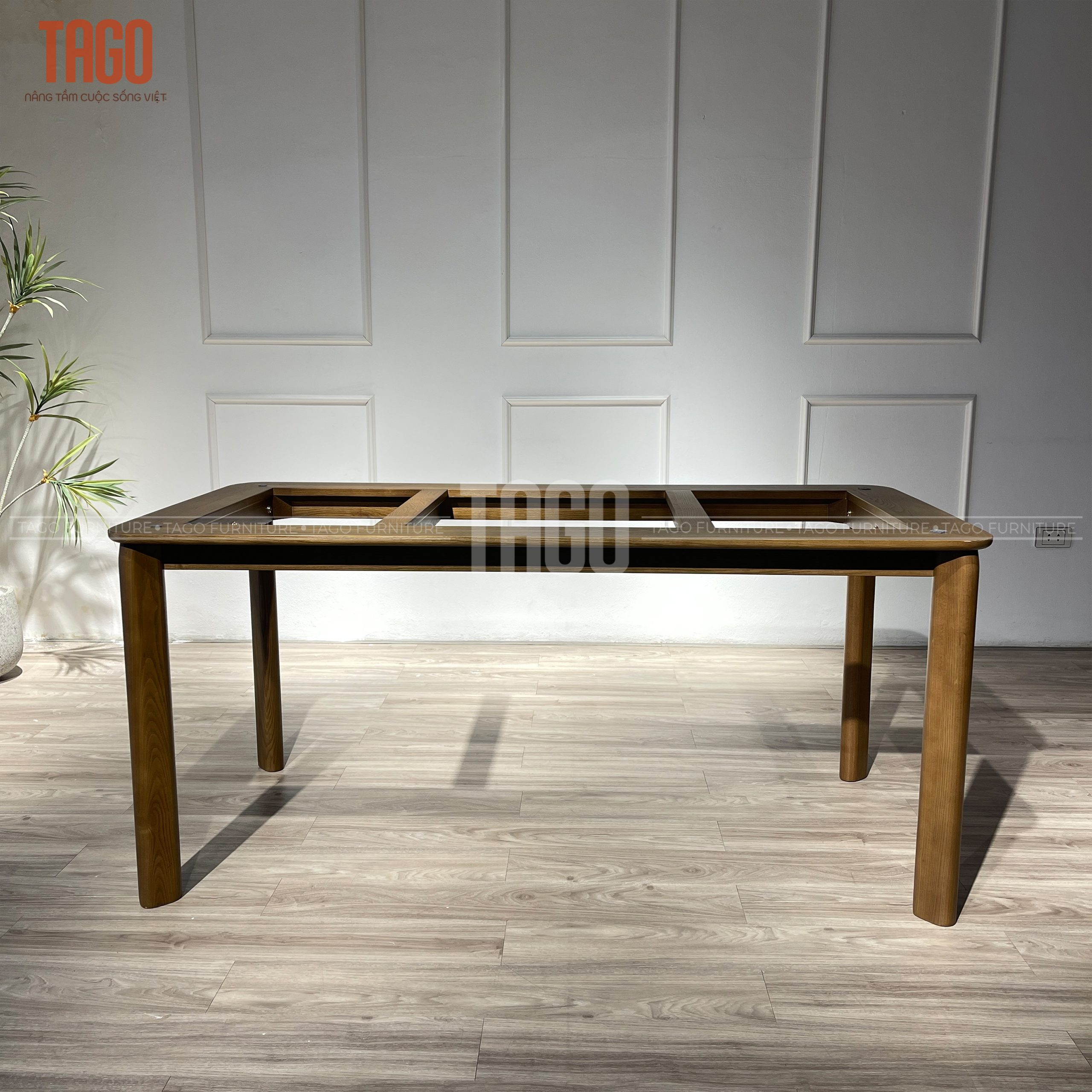 Khung bàn được chế tác từ gỗ sồi tự nhiên, tông màu vàng rêu sang trọng, mang lại sự vững chãi và độ bền cao. Gỗ được xử lý sấy đạt độ ẩm tiêu chuẩn 10–12%, hạn chế cong vênh, mối mọt trong điều kiện khí hậu nhiệt đới. đồng thời giữ được vẻ đẹp tự nhiên và hài hòa trong không gian sống.