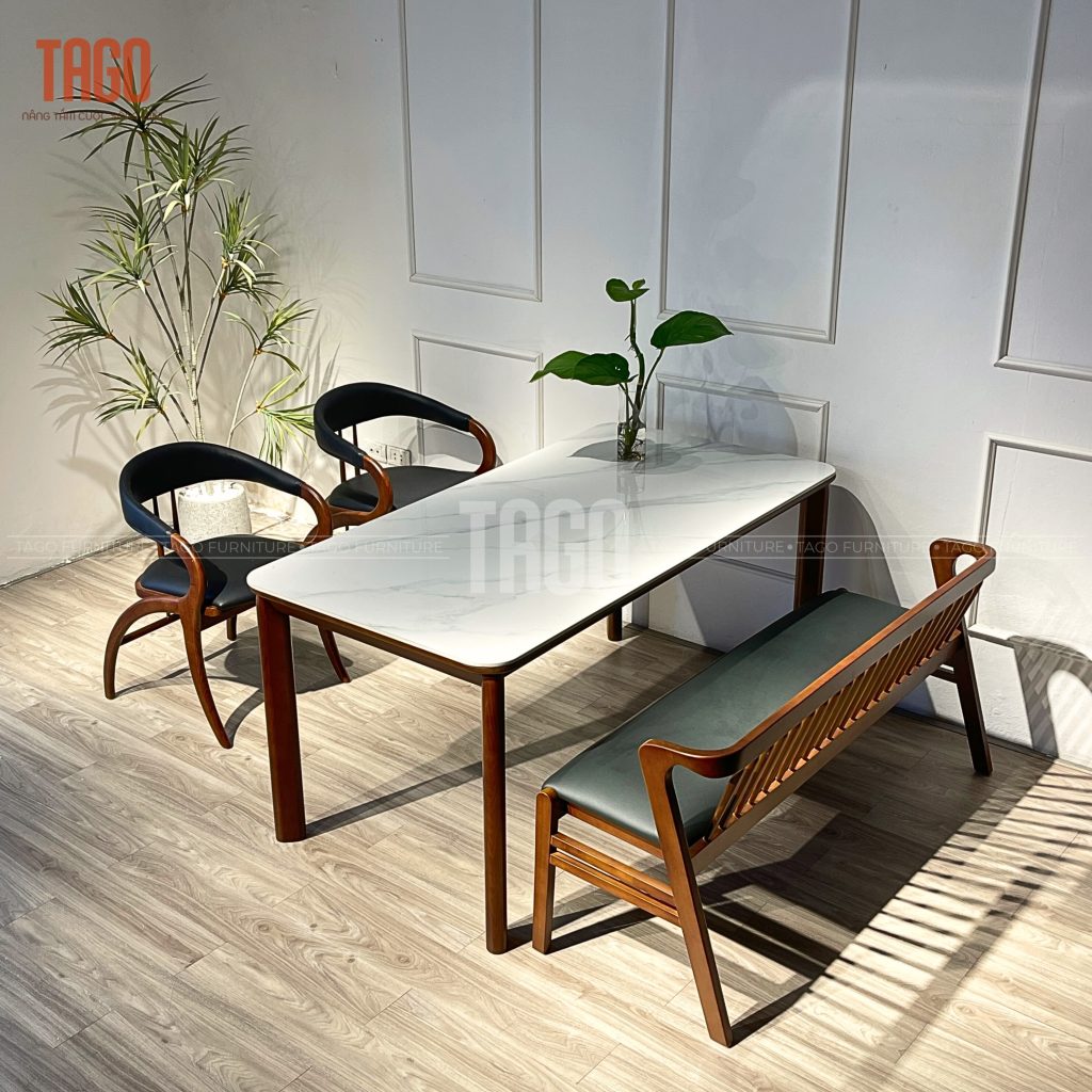 Bàn dài 1595mm, phù hợp với gia đình đông thành viên hoặc những buổi họp mặt thân mật. Kết cấu bố trí ghế – bench khoa học, giúp bữa ăn thêm thoải mái và gần gũi.