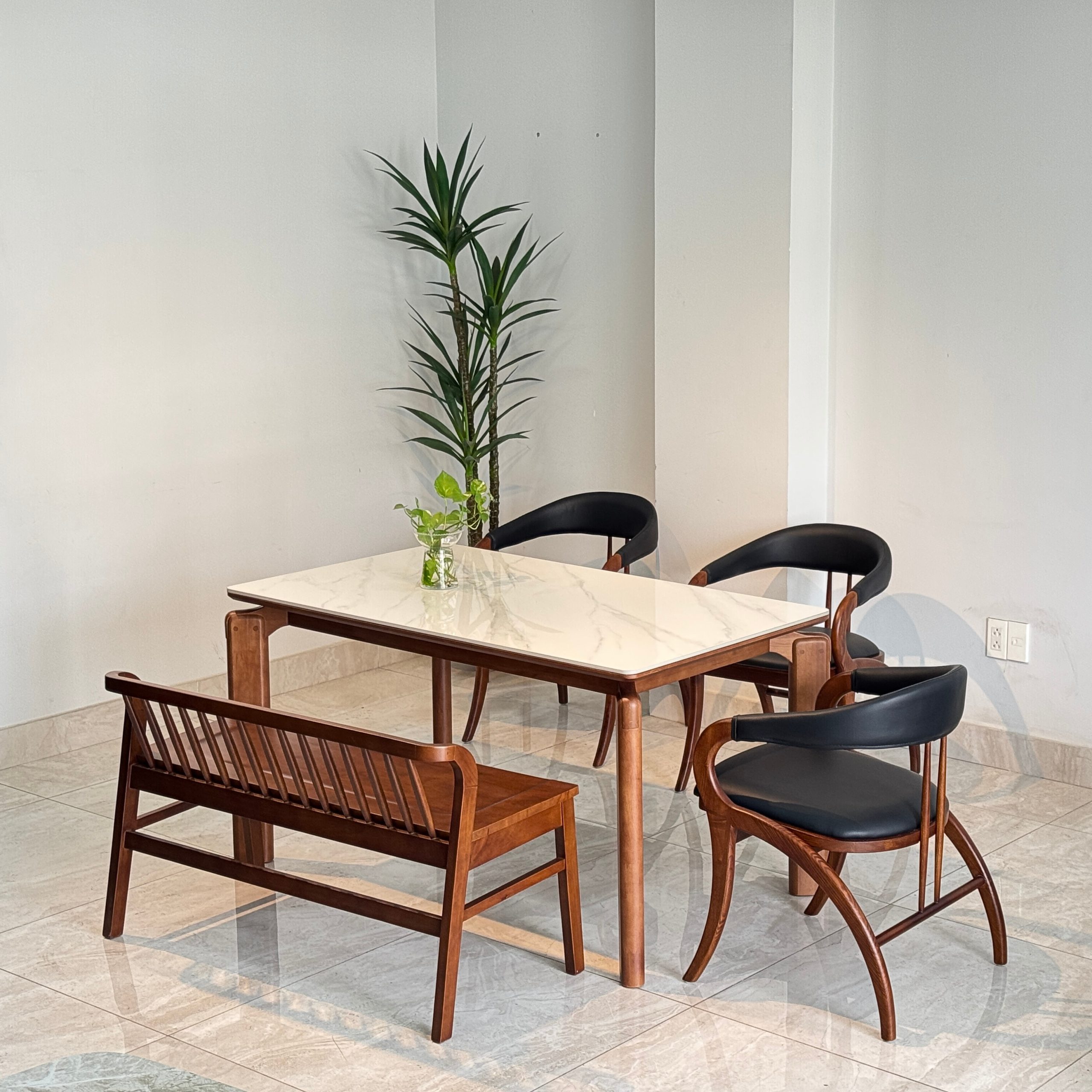 | Chất liệu gỗ | Bàn, Bench gỗ cao su – mặt đá ceramic, ghế gỗ sồi |