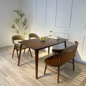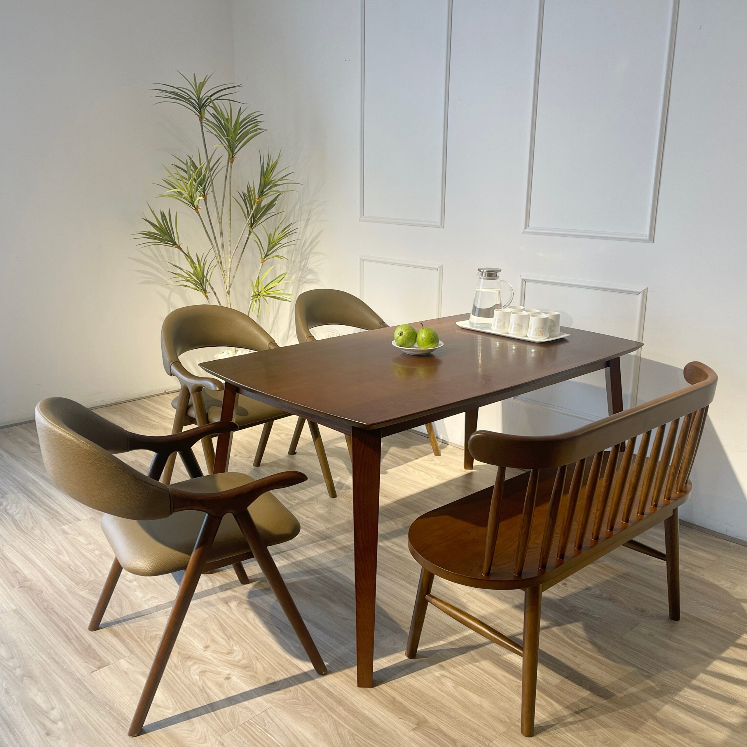 Bộ bàn ăn được chế tác từ gỗ sồi tự nhiên nhập khẩu, nổi bật với sắc nâu trầm sang trọng cùng đường vân gỗ tinh tế. Mặt bàn phẳng mịn, chân vát nhẹ tạo dáng thanh thoát nhưng vẫn vững chãi, thể hiện rõ nét tinh thần hiện đại – bền vững – đẳng cấp.