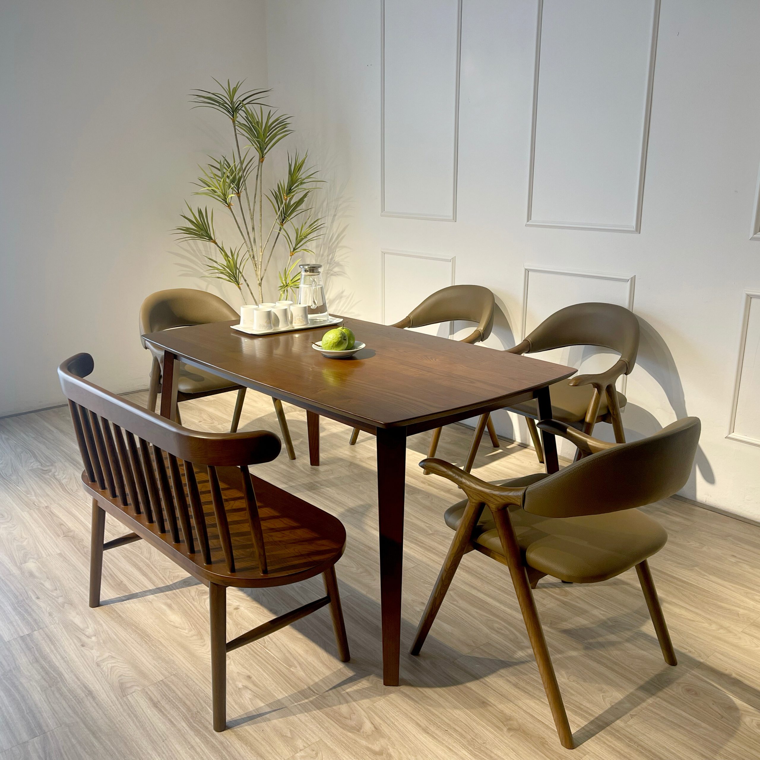 Bộ bàn ăn được chế tác từ gỗ sồi tự nhiên nhập khẩu, nổi bật với sắc nâu trầm sang trọng cùng đường vân gỗ tinh tế. Mặt bàn phẳng mịn, chân vát nhẹ tạo dáng thanh thoát nhưng vẫn vững chãi, thể hiện rõ nét tinh thần hiện đại – bền vững – đẳng cấp.