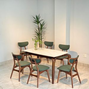 | Chất liệu | Khung bàn gỗ sồi – mặt đá ceramic, Ghế gỗ cao su |