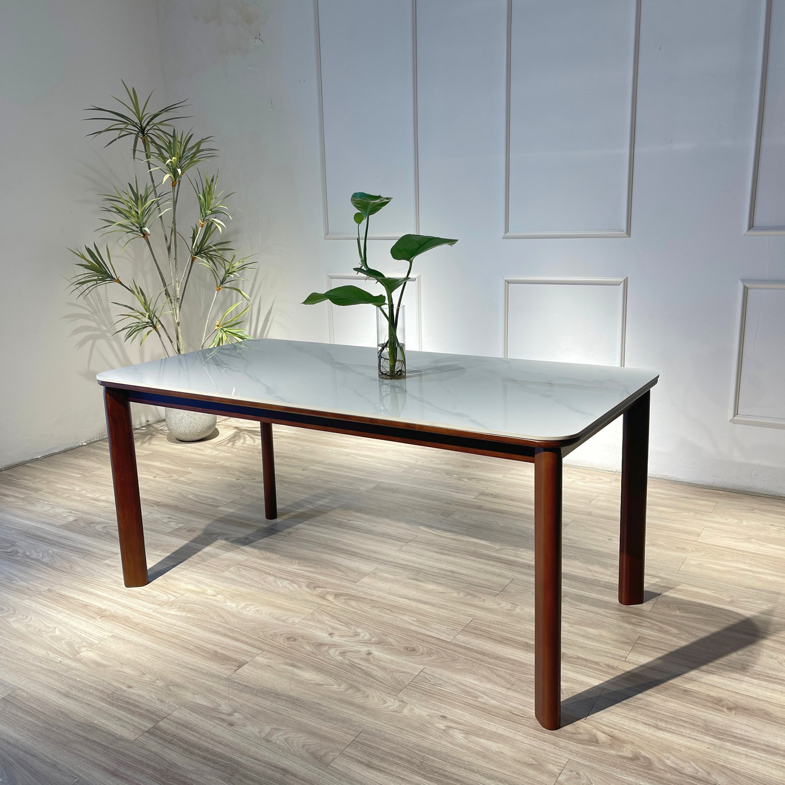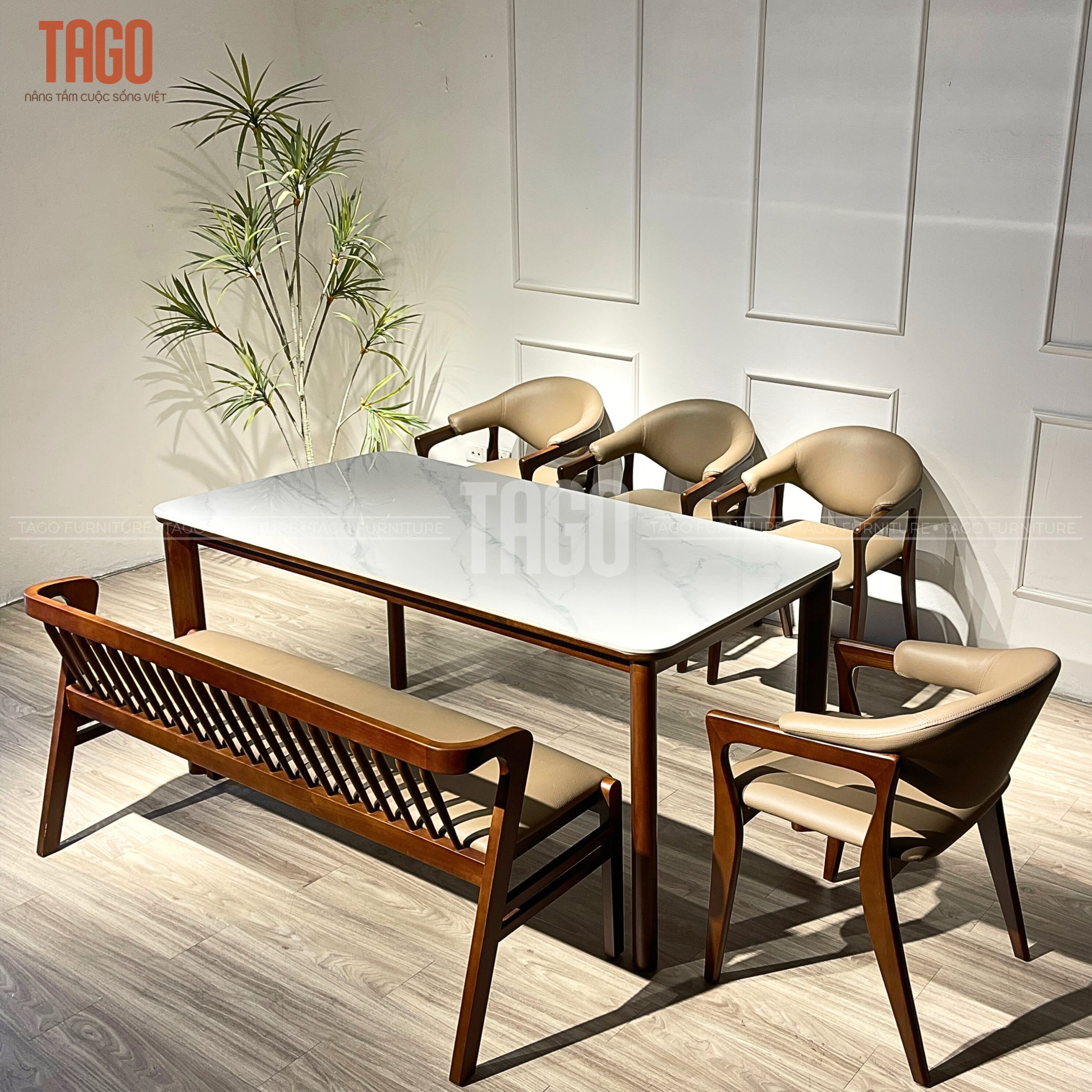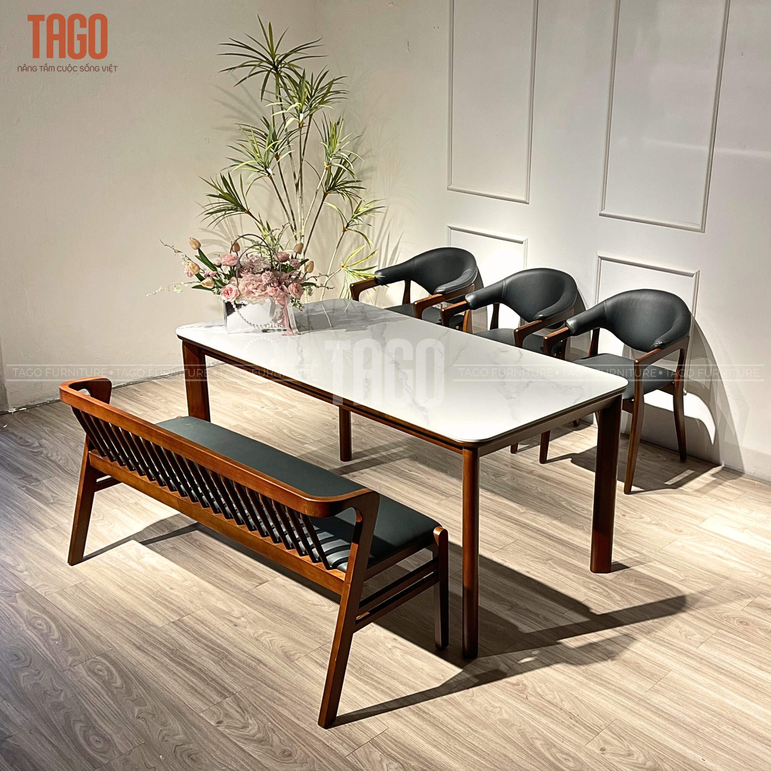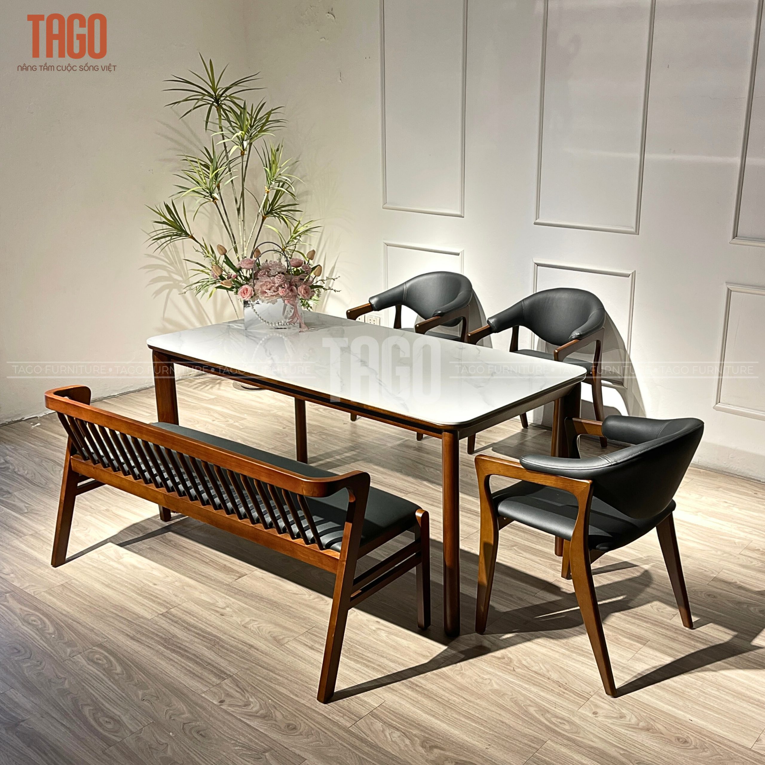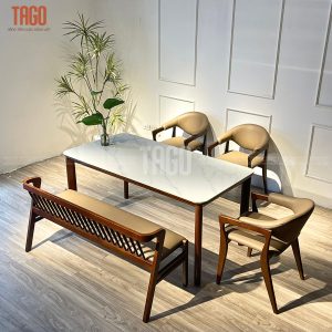 Bộ bàn ăn mặt đá Ceramic – Ghế & khung bàn gỗ sồi – Bench gỗ cao su