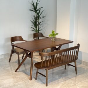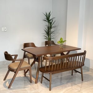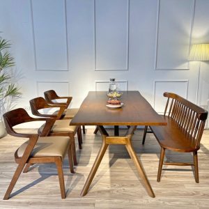 Bộ bàn ăn mang phong cách hiện đại pha cổ điển, tạo điểm nhấn cho không gian với đường nét thanh mảnh, tông gỗ nâu sậm sang trọng và bề mặt mịn màng. Sự kết hợp giữa bàn – bench gỗ sồi tự nhiên và ghế gỗ cao su tạo nên tổng thể hài hòa, vừa vững chắc vừa tinh tế.