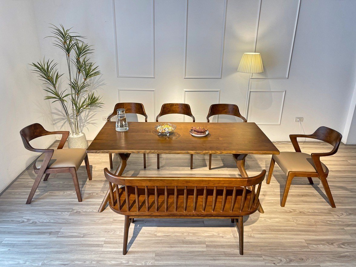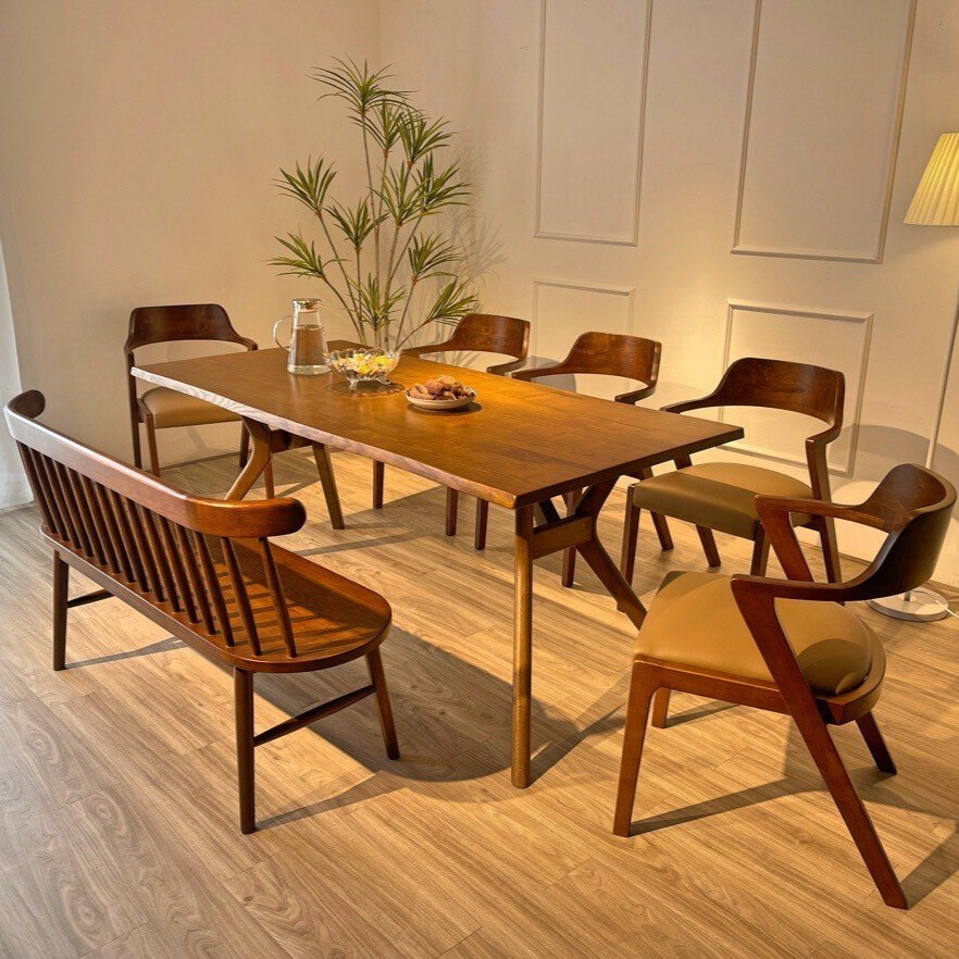 Bộ bàn ăn mang phong cách hiện đại pha cổ điển, tạo điểm nhấn cho không gian với đường nét thanh mảnh, tông gỗ nâu sậm sang trọng và bề mặt mịn màng. Sự kết hợp giữa bàn – bench gỗ sồi tự nhiên và ghế gỗ cao su tạo nên tổng thể hài hòa, vừa vững chắc vừa tinh tế.