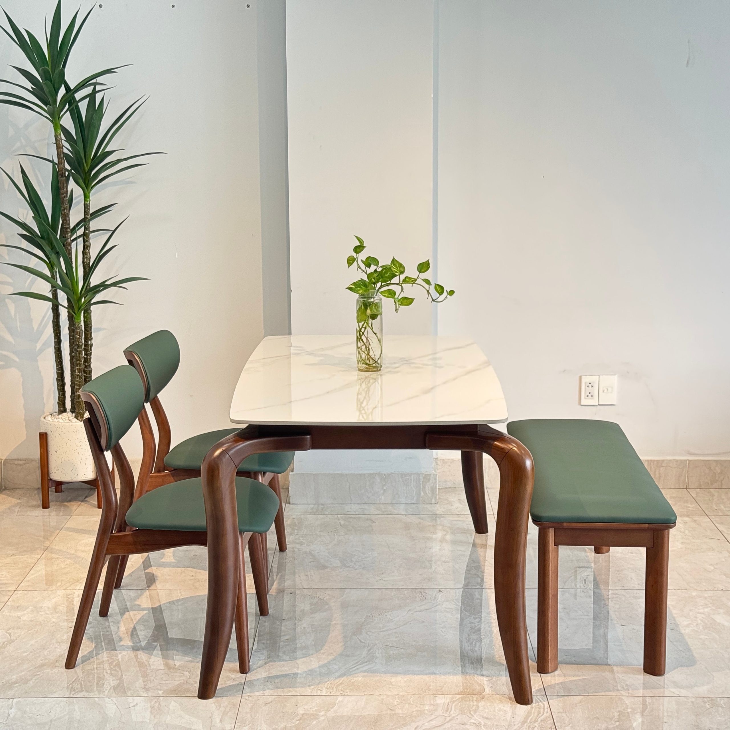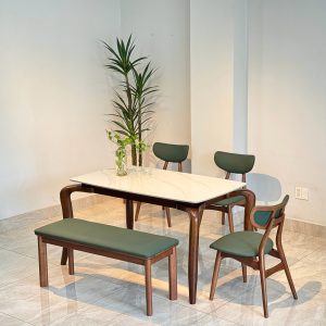 | Chất liệu gỗ | Bàn gỗ sồi- mặt đá ceramic, Ghế – Bench gỗ cao su |