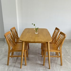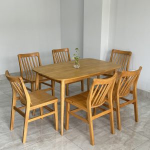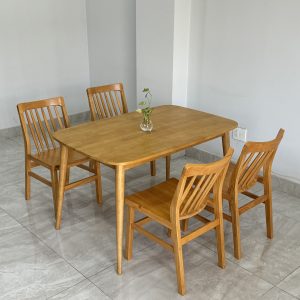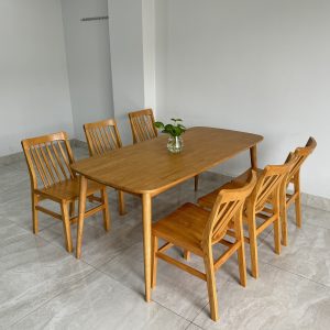 Thiết kế thanh mảnh – tinh gọn: Chân bàn và ghế được bo mềm mại, tựa lưng nan cong nhẹ ôm dáng, tạo sự thoải mái cho mọi thành viên trong bữa ăn.