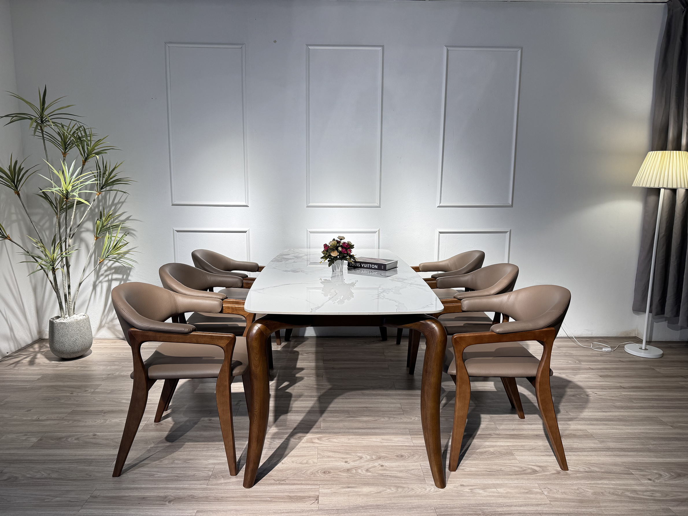 Chiếc ghế được thiết kế với form dáng cong ôm lưng nhẹ nhàng, tạo cảm giác êm ái và nâng đỡ cột sống khi ngồi lâu. Phần tay vịn gỗ liền khối được vát mềm mại, kết hợp hài hòa với phần chân ghế bo tròn, mang đến tổng thể thanh lịch, phù hợp với cả không gian nội thất hiện đại lẫn tân cổ điển.